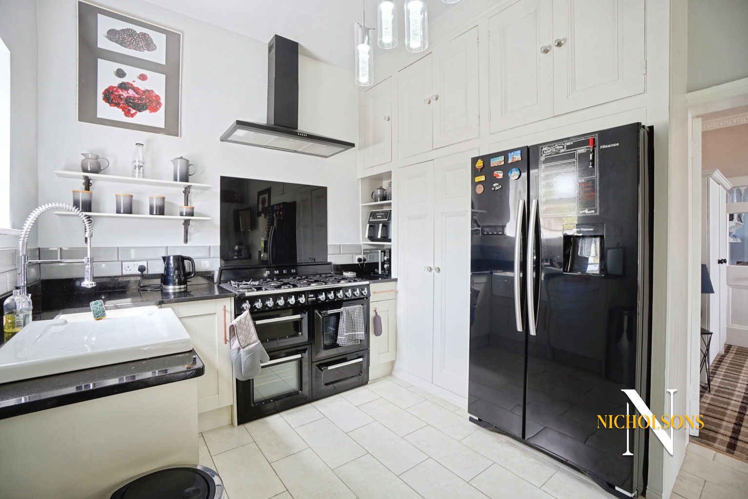 The property’s heart is undoubtedly its stunning kitchen diner. Perfectly equipped for family living and entertaining, it features high-quality fitted appliances, a large SMEG range cooker, and a separate pantry for additional storage. The space is as practical as it is beautiful, seamlessly blending style with functionality.